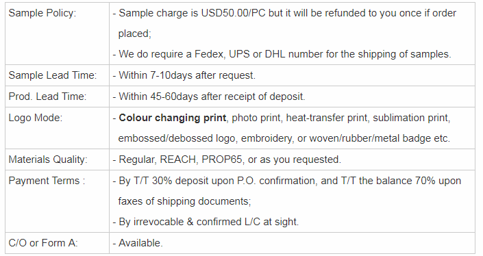A5: Sample charge is USD50.00/PC and the charge will be refund to you once if order placed; |